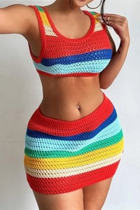 Features: Multicolor Striped/ Crochet Knit/ Sleeveless/ Round Neck/ Bodycon/ Mini